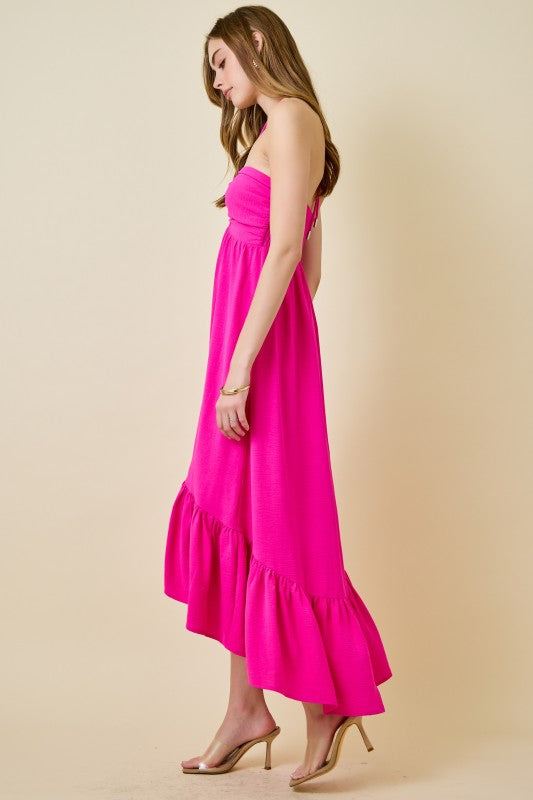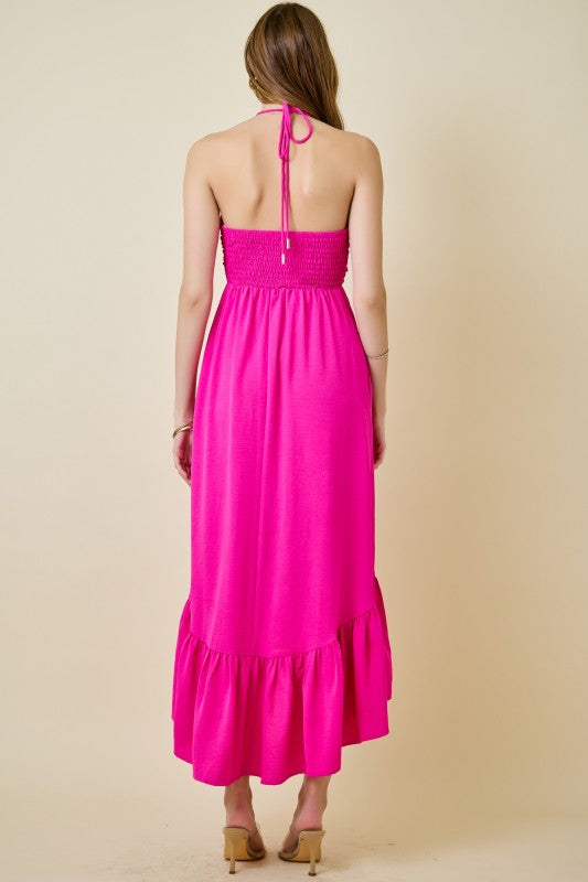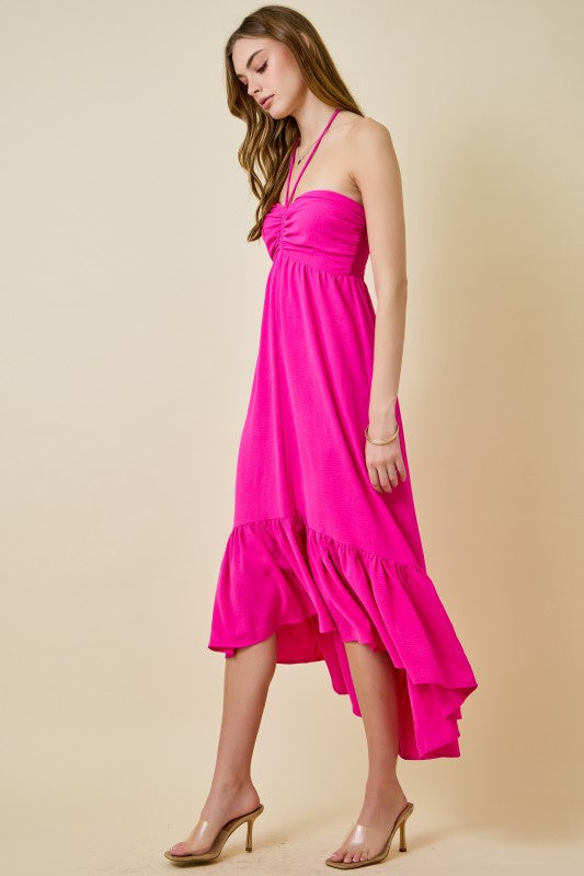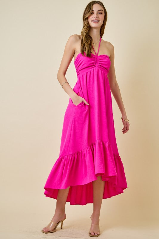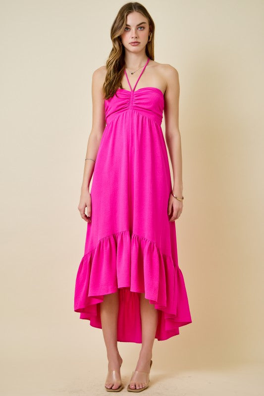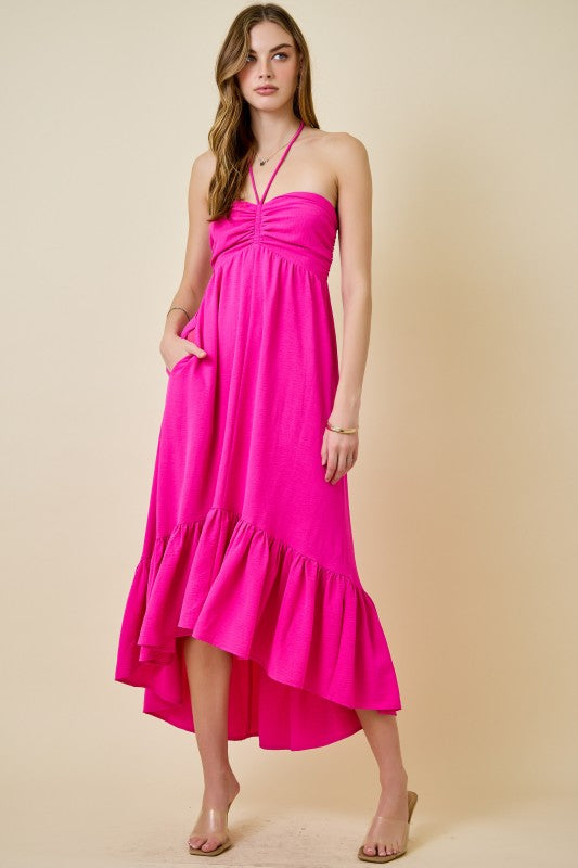 Elevate your style with our Nothing to Lose Midi Dress. The ruched halter design accentuates your curves while the ruffle hem adds a playful touch. Perfect for any occasion, this dress is sure to make you feel confident and chic. Get ready to turn heads!