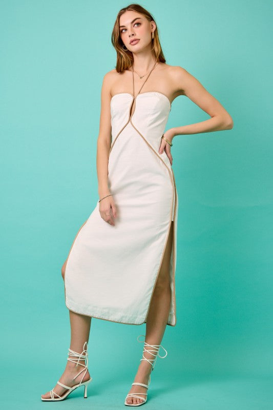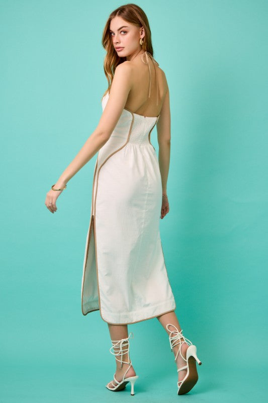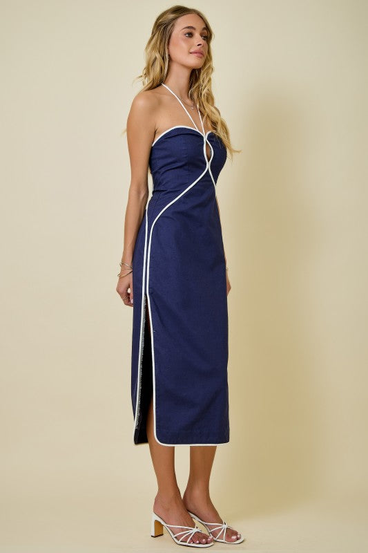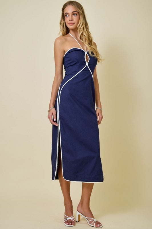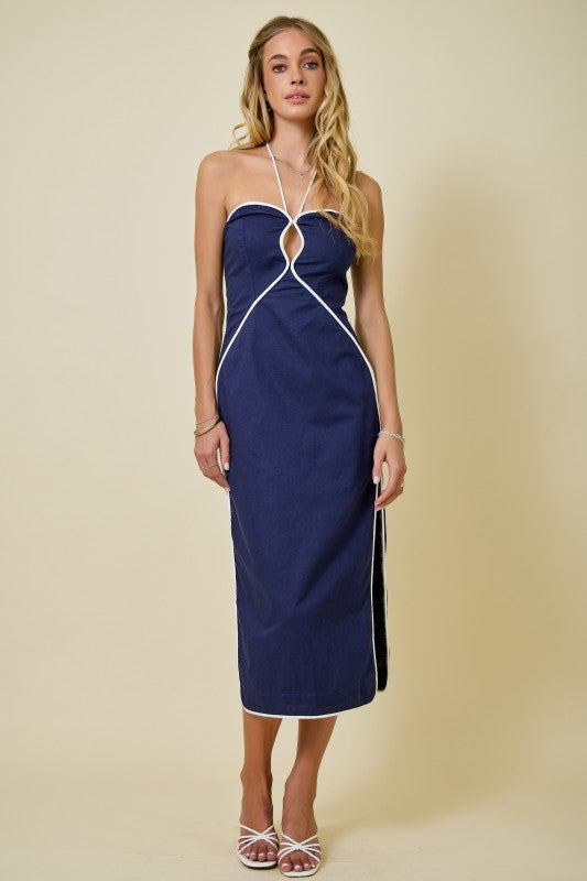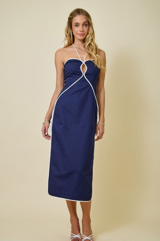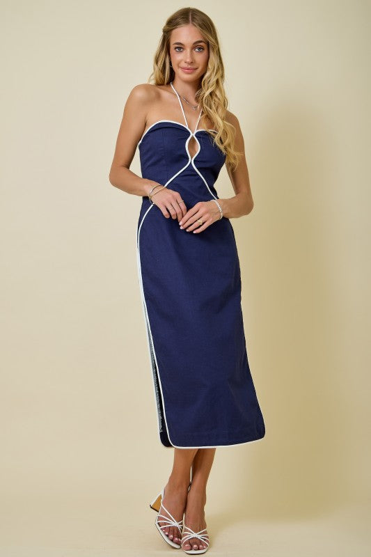 The Piper Midi Dress combines timeless elegance with modern edge. This stunning halter neck design features a flattering cutout detail that adds intrigue while maintaining sophistication. Contrast piping traces the silhouette, creating sharp definition and visual interest. Perfect for date nights, cocktail events, or elevated casual outings, this midi-length dress offers the ideal balance of allure and refinement. The halter neckline provides secure support and flatters most body types, while the midi length ensures versatile styling for any season. Make a memorable impression in this show-stopping piece that transitions effortlessly from day to evening.