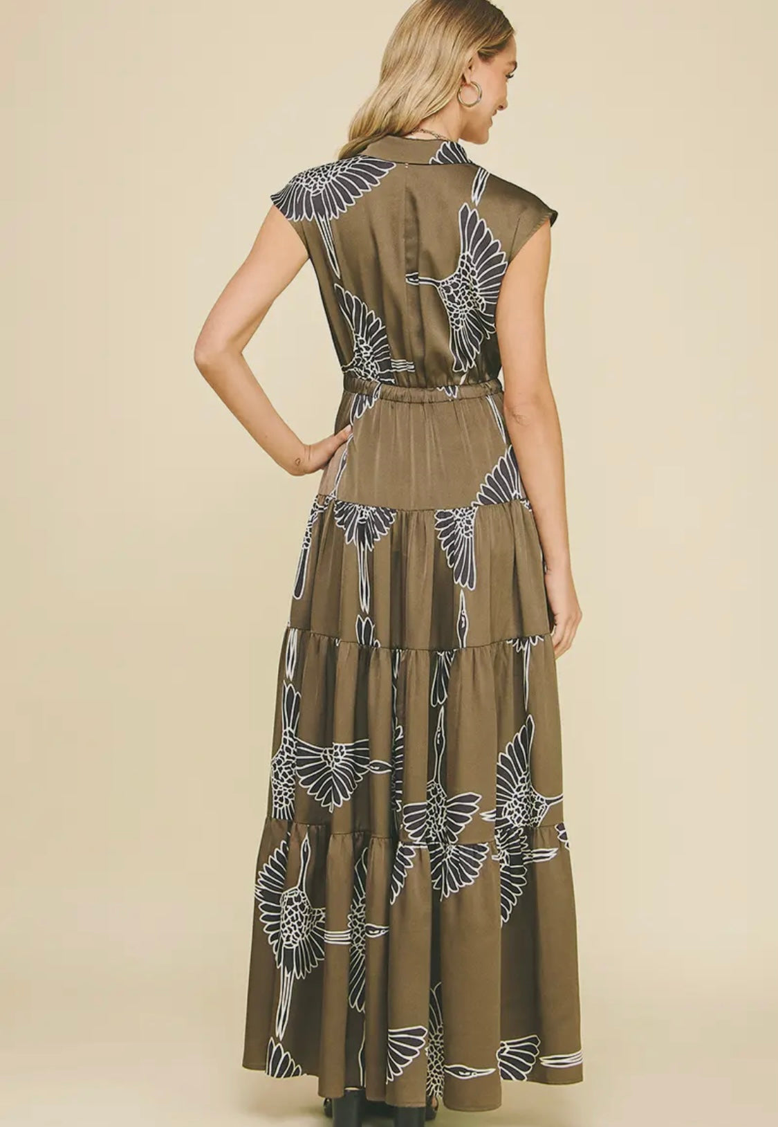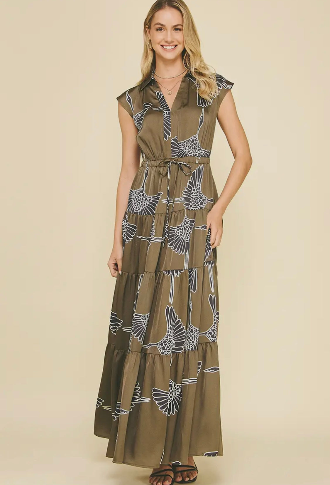 The Print Tiered Maxi Dress combines a timeless collar and a flattering V-neck with feminine cap sleeves for a graceful silhouette. Its tiered detail offers elegant movement, while the self-tie waist allows you to customize the fit, making this dress perfect for day-to-night wear with effortless style.