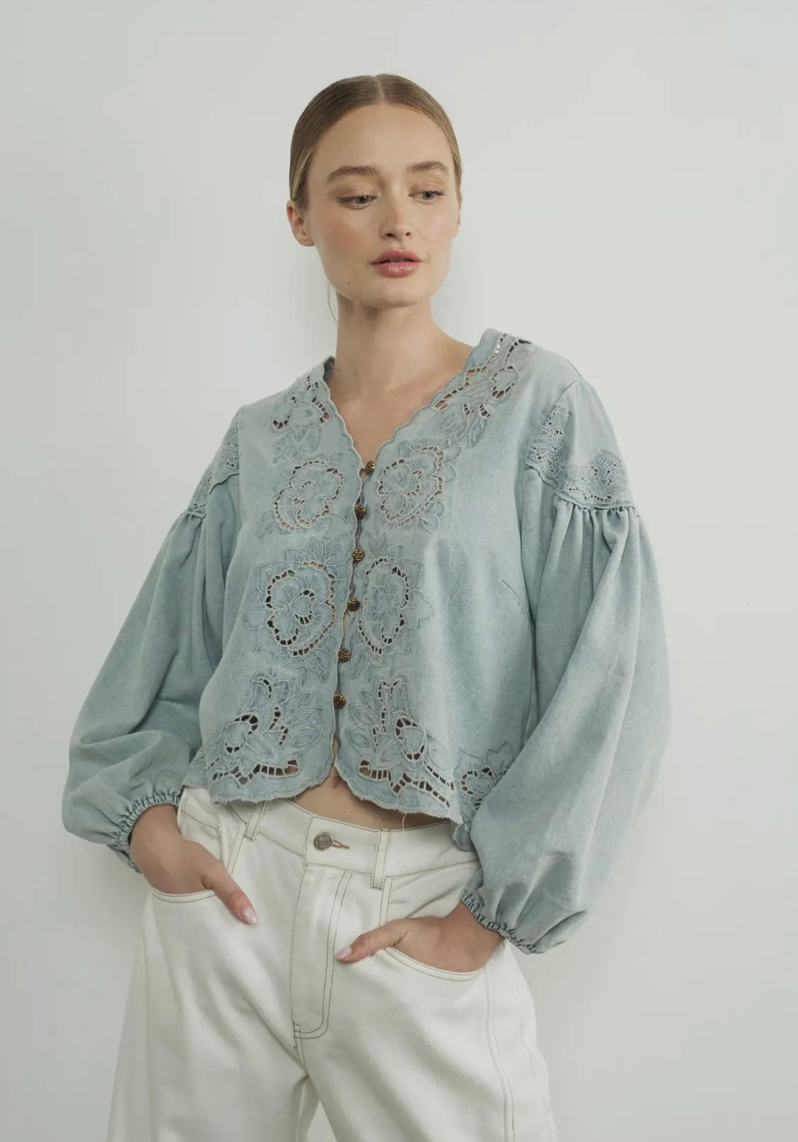 Discover the perfect blend of classic denim and delicate craftsmanship with our Embroidery Blouse. Featuring dramatic volume sleeves, this top makes a bold statement while remaining effortlessly comfortable. The detailed embroidery adds a unique and stylish flair, elevating your everyday look. Ideal for those who want to stand out with subtle sophistication, this blouse pairs beautifully with your favorite jeans or skirts for versatile, fashionable wear.